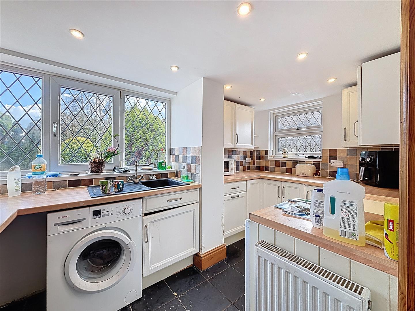 Windows to side and rear, a range of fitted wall and base units with work surfaces, composite single drainer and bowl sink. Space and plumbing for washing machine. Space for freestanding oven, fridge and tumble drier.