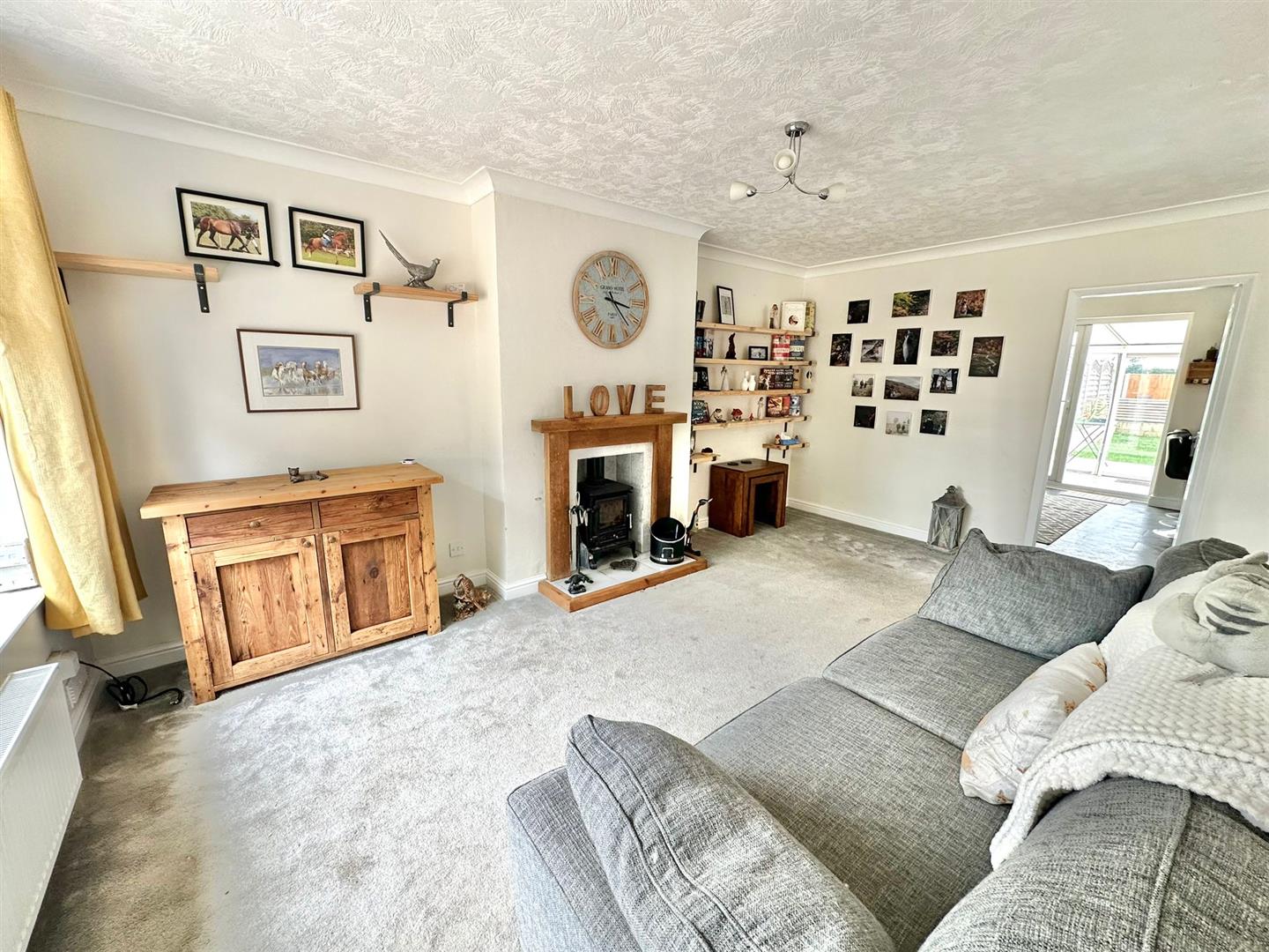 Carpeted through lounge diner with front and side window, a wood surround fireplace, coving to ceiling and two radiators.