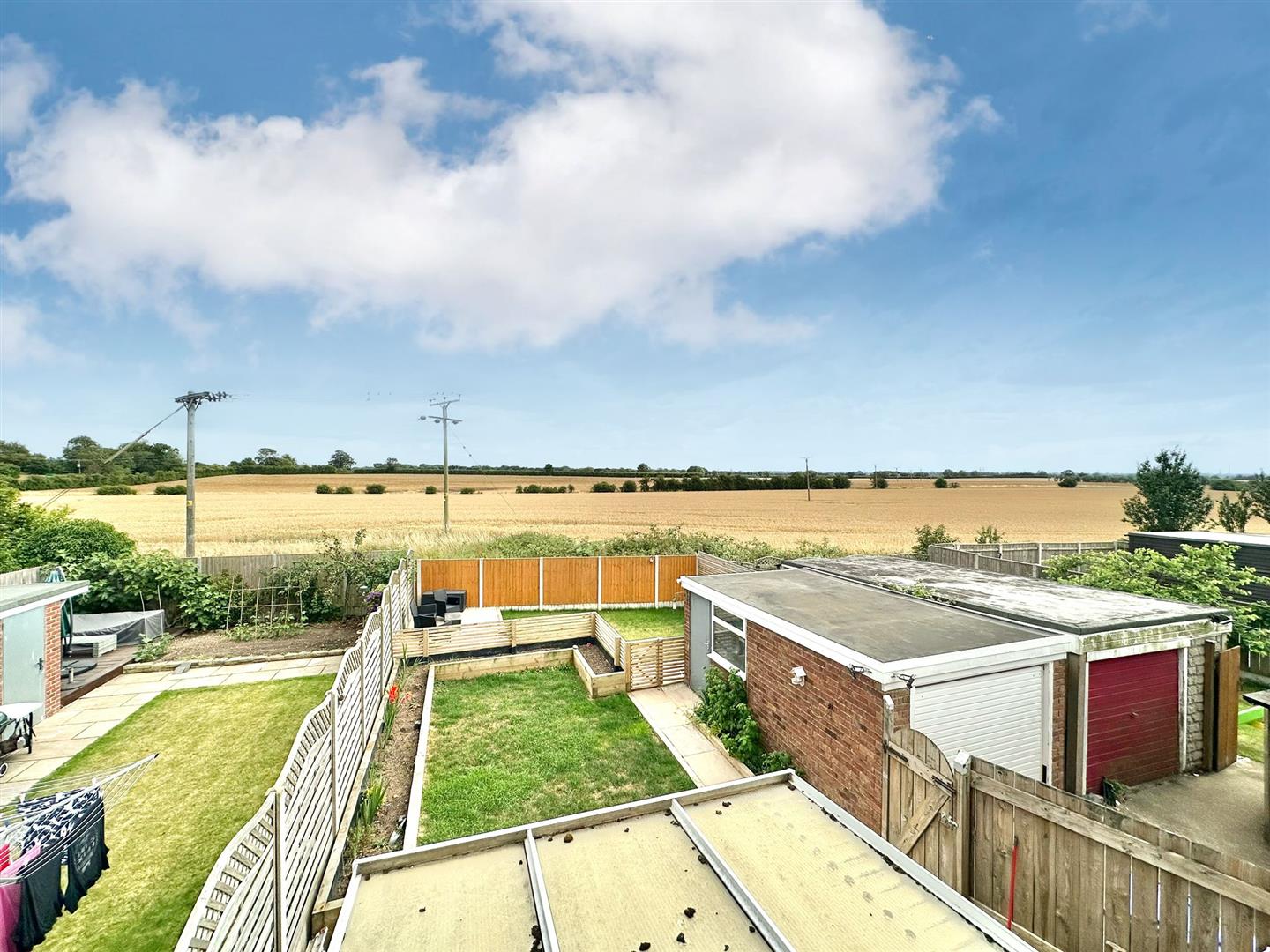 This south facing garden with open fields is laid mainly to lawn with a paved patio area, fenced boundaries, planted boarders and is split into two areas