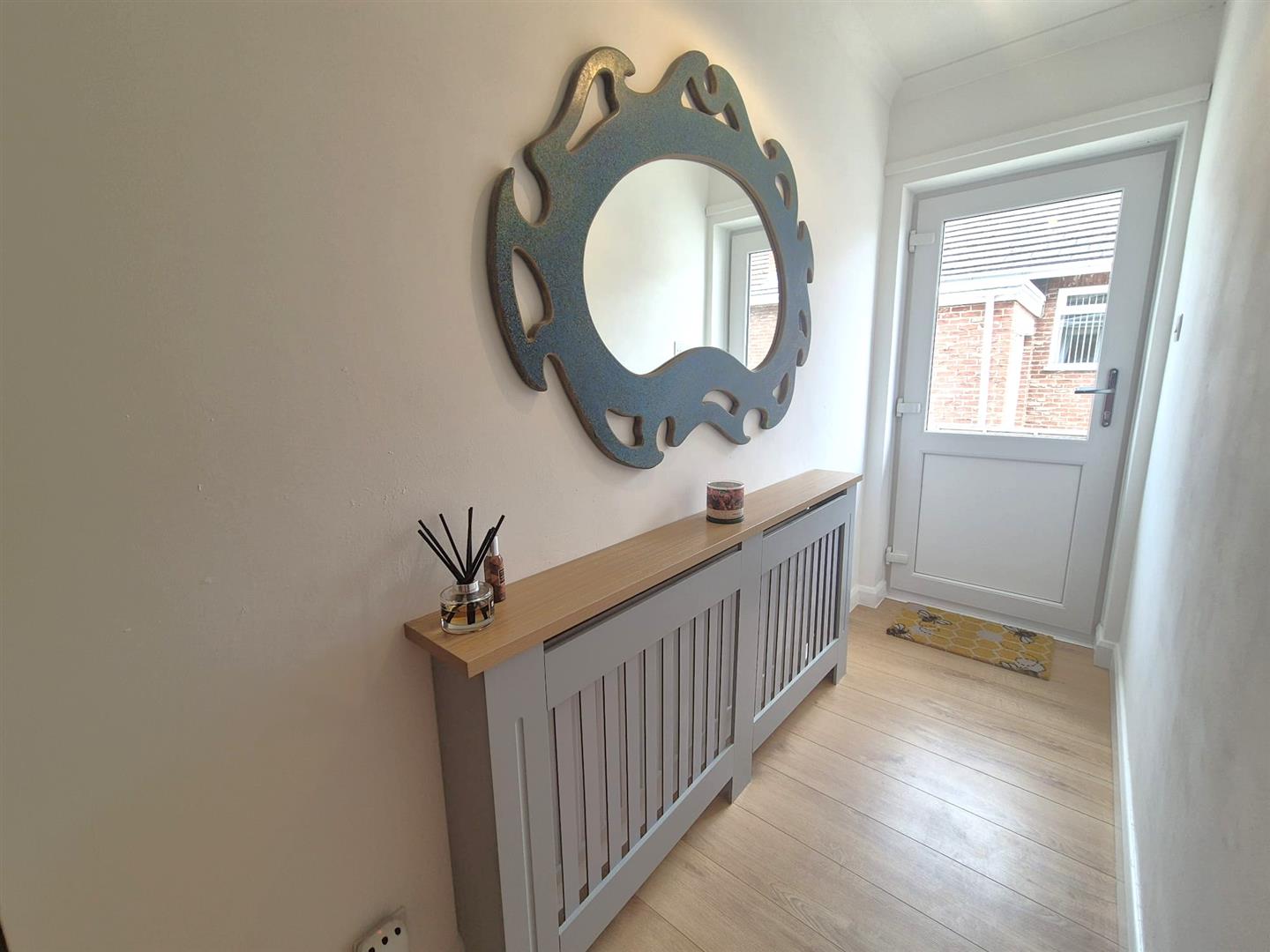 Entrance door situated on the side of the property, leading into the hallway which includes a cupboard, radiator, laminate floor and loft access.
