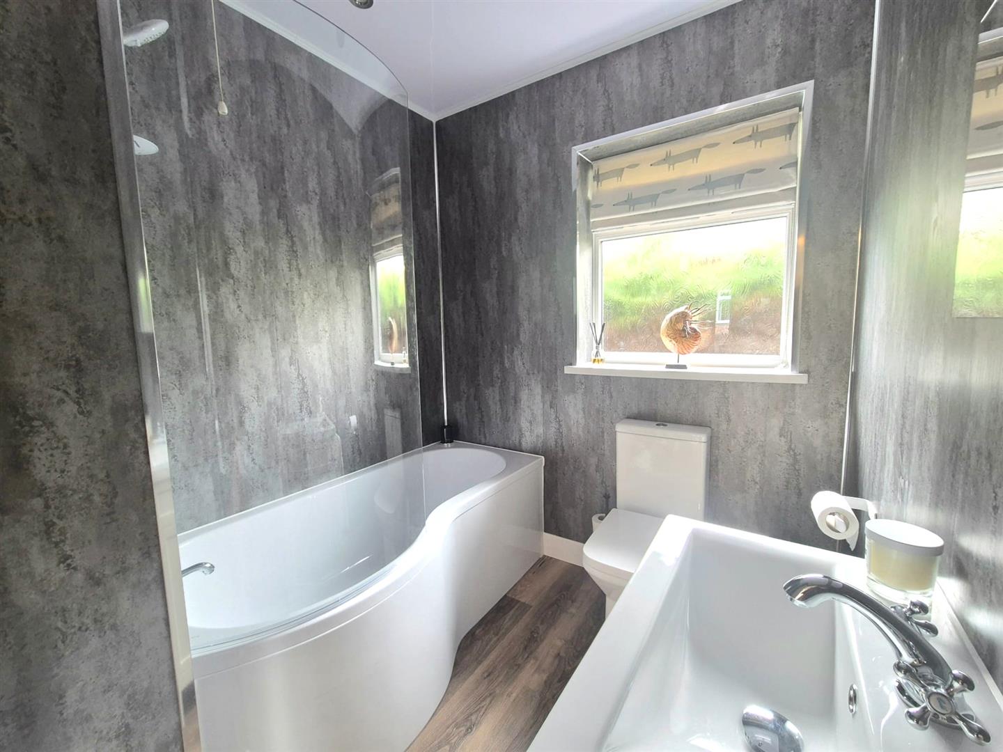 Side window, WC, hand wash basin with storage under, panelled bath with shower over, heated towel rail, laminate flooring, shower boarding to walls
