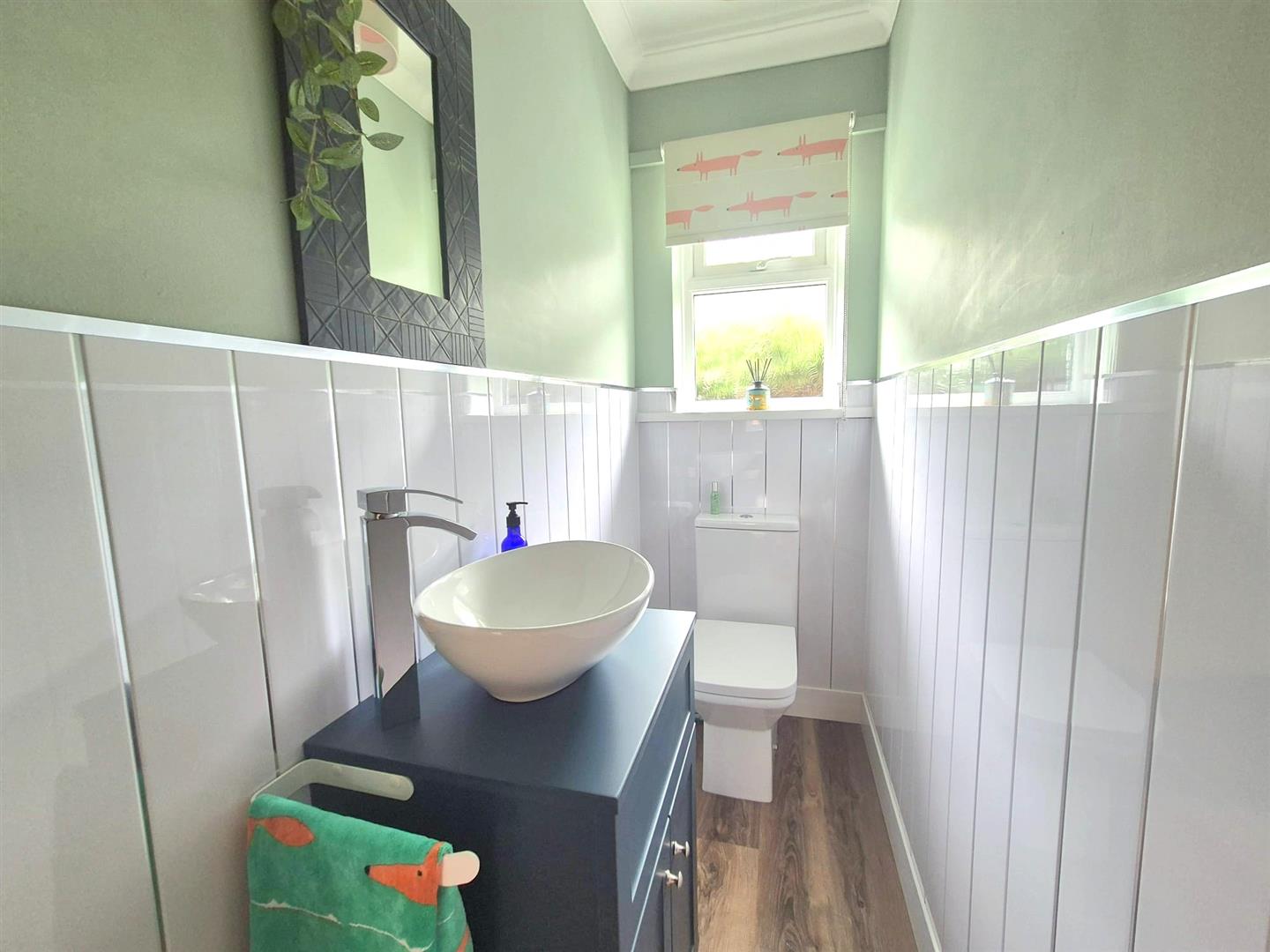 Side window, W.C, hand wash basin with storage under, laminate flooring and coving to ceiling