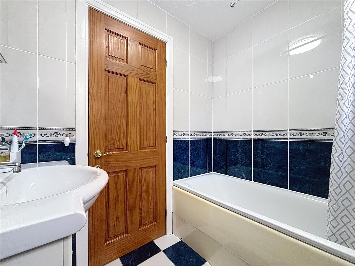 Window to side, pedestal hand wash basin, panelled bath with shower over, W.C, shaver point, tiled walls and floor and heated towel rail.