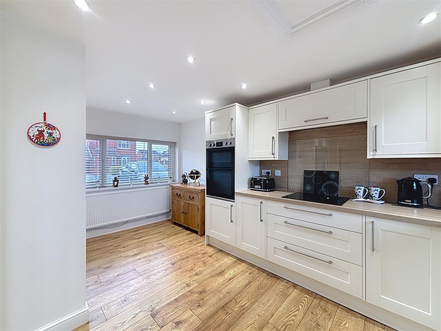 Windows to front and rear, French doors to conservatory. A range of fitted wall and base units with complimentary work surfaces, one and a half bowl sink unit, built in electric hob and double oven. Space for American style fridge freezer, space and plumbing for washing machine and space for tumble dryer. Understairs cupboard, extractor fan, laminate flooring and two radiators.